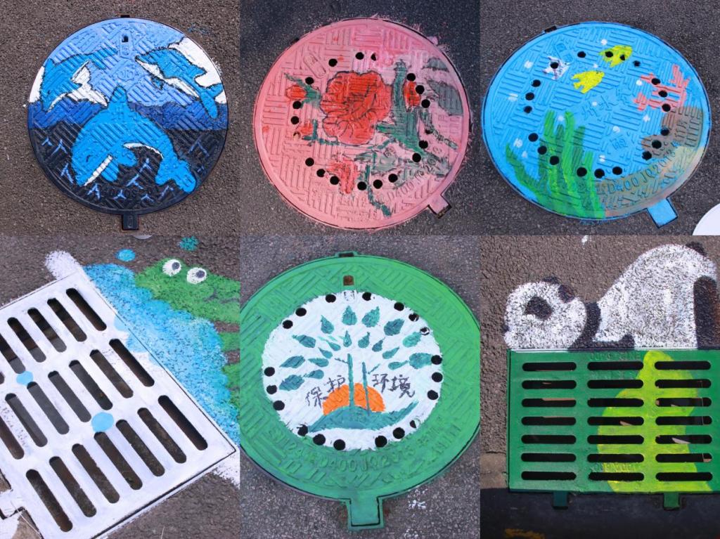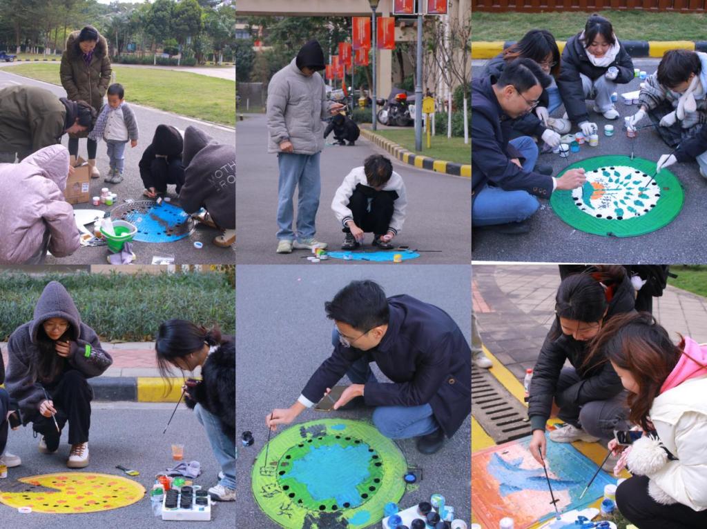 活动前期,同学们广泛搜集素材,准备价格适宜、防雨、环保的涂料和绘图工具,分配好各自的任务。活动当天,志愿者们各自分组,带着分好的颜料、水桶和画笔到井盖边开始了创作。活动当天,寒风凛冽,但抵挡不住同学们的热情,他们认真地讨论构图,以井盖为“画纸”,发挥自己的想象力和创造力,完成勾轮廓、刷底色、填色、修边等一道道程序。在同学们的妙笔巧手下,一个个黑漆漆、冷冰冰、不起眼的下水道井盖焕然一新,像是被赋予了新的生命,呈现出了一幅幅绚丽夺目、鲜艳有趣、美丽可爱的作品,引来了众多居民驻足观看。