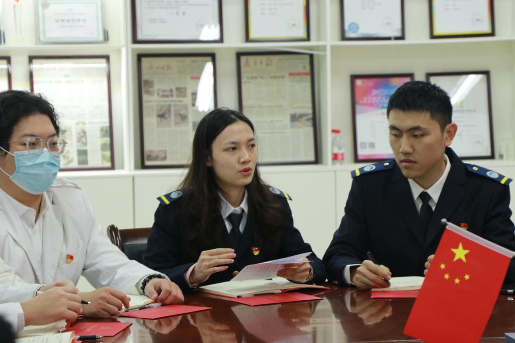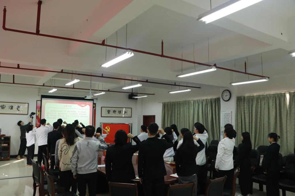 6位新发展的预备党员在冼永权的领誓下,面向党旗进行了入党宣誓,与会党员重温入党誓词。郑德华为新发展党员佩戴党员徽章,王有才、邓焱分别为新发展的预备党员和党员赠送“政治生日”贺卡、纪念册。