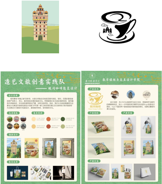 开平是著名的侨乡,大部分侨胞去往南美的委内瑞拉、智利、巴西等著名咖啡原产地务工,从国外带回了咖啡文化。根据我们的调研发现,蚬冈镇有许多咖啡店,但包装同质化严重,没有当地特色。团队成员匠心独具,以咖啡杯为主体,以当地经典建筑为主要设计元素进行咖啡包装设计,选取“开平第一楼”之称的瑞石楼以及当地特色“煲仔饭剧场”为主要设计元素进行包装设计,将咖啡杯与蚬冈的碉楼相结合,加入中国的传统元素祥云形成创意设计,下面的曲线既是对咖啡杯垫的简化,也象征着蚬冈潭江的波纹,展现出蚬冈特色。