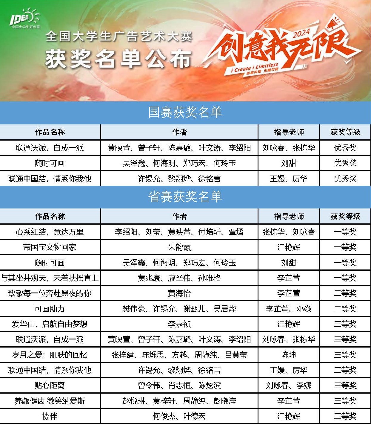 近日,第16届全国大学生广告艺术大赛(以下简称“大广赛”)比赛结果揭榜,广航学子们以卓越的创意和专业实力,在全国众多高校中脱颖而出,荣获全国赛优秀奖3项,广东省赛一等奖4项、二等奖2项和三等奖7项,成绩斐然。