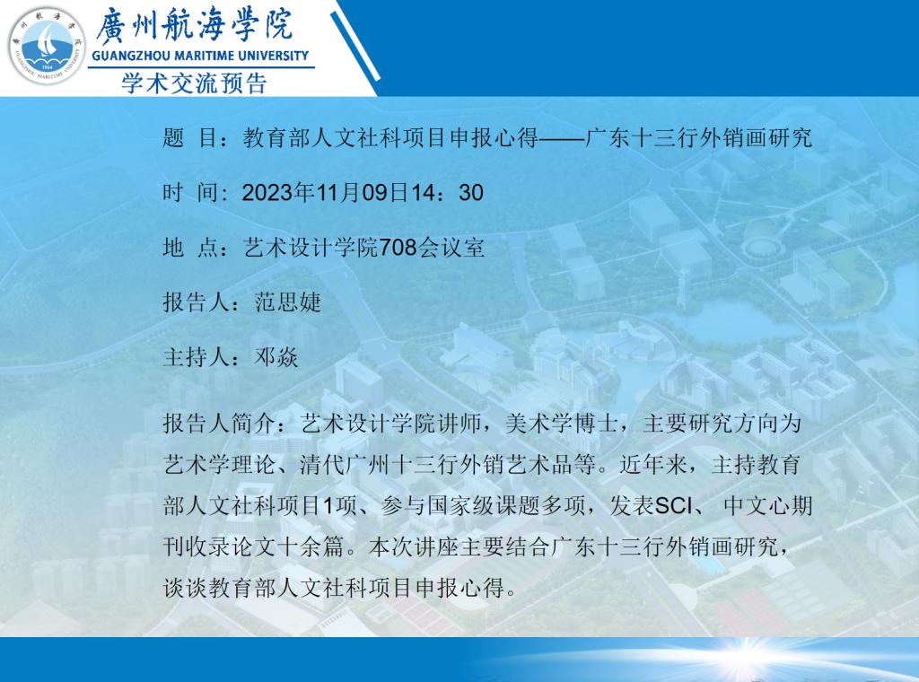 范思婕博士学术报告会预告:《教育部人文社科项目申报心得——广东十三行外销画研究》