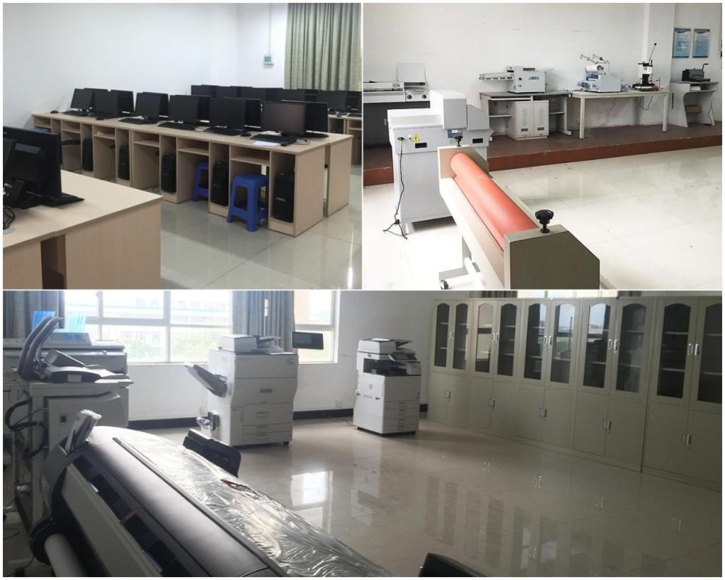 数码设计实训室位于文理楼604、605及606室,面积约260平米。由两个课程实训室和一个作品输出室组成。其中,课程实训室配备76台图形设计工作站和2台教学触控互动大屏等多媒体设备,满足项目前期实训教学需求;作品输出室配备彩色生产型数码印刷系统、宽幅彩色多功能打印机、彩色绘图仪、彩色喷墨打印机、无线胶装机、数控液压切纸机、自动压痕机、热膜机、数码相机、图形输出计算机等设备,满足后期平面类作品打印输出及装帧的实训要求。本实训室累计投入经费约140万元。