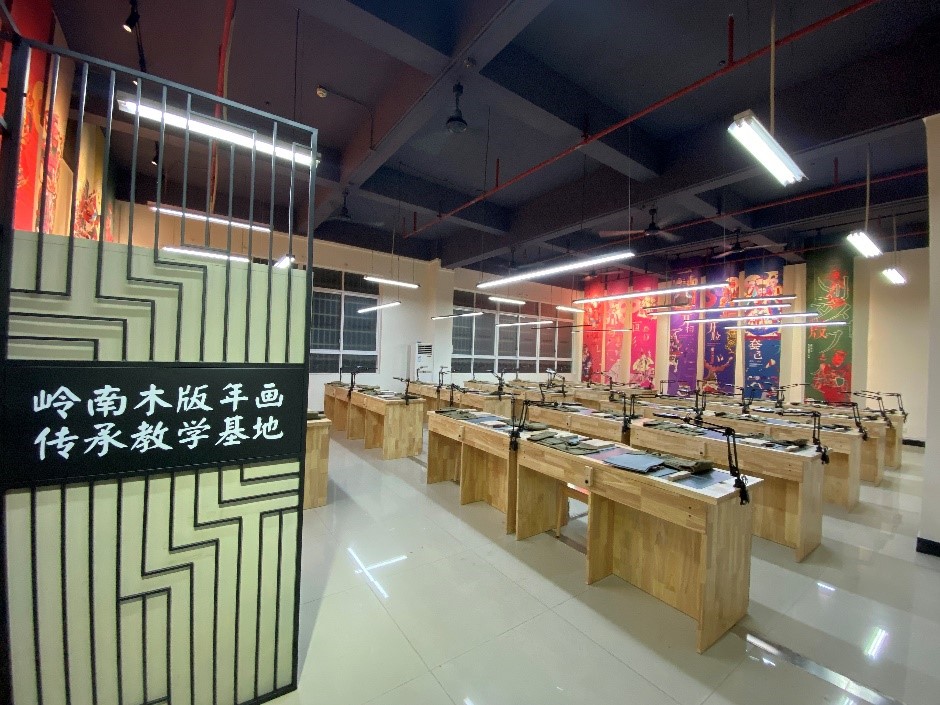 木版年画实训室主要承担我院数字媒体艺术专业和装饰艺术专业的木版年画实训教学任务,同时满足其他类型传统工艺课程教学需求。开的设实训课程有《木版年画》、《广绣》、《广府通草画》、《榄雕》、《中国画》、《古法装帧》等课程。实训室在满足日常教学、教师科研的基础上,同时为工艺品制作、工艺绘画、专业绘画、计算机设计与制作等行业的相关企业提供技术应用和技术创新服务,不仅能够培养学生动手能力和创新能力,更能够发扬中华民族的传统文化。