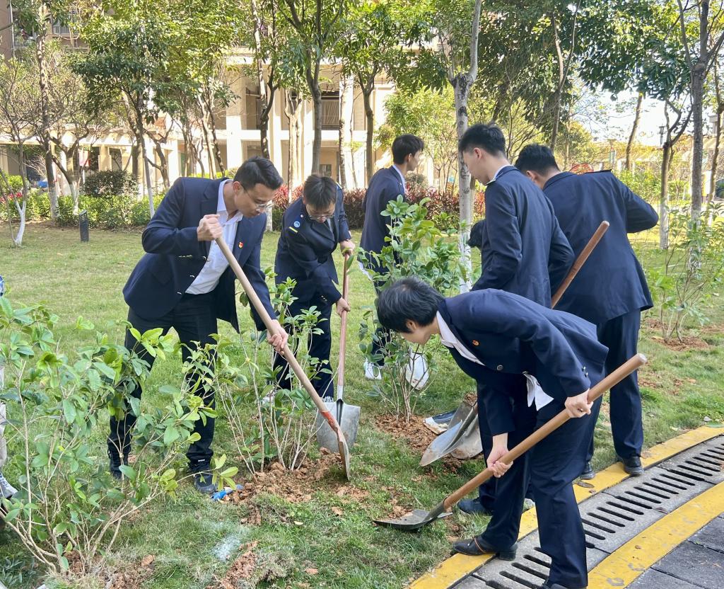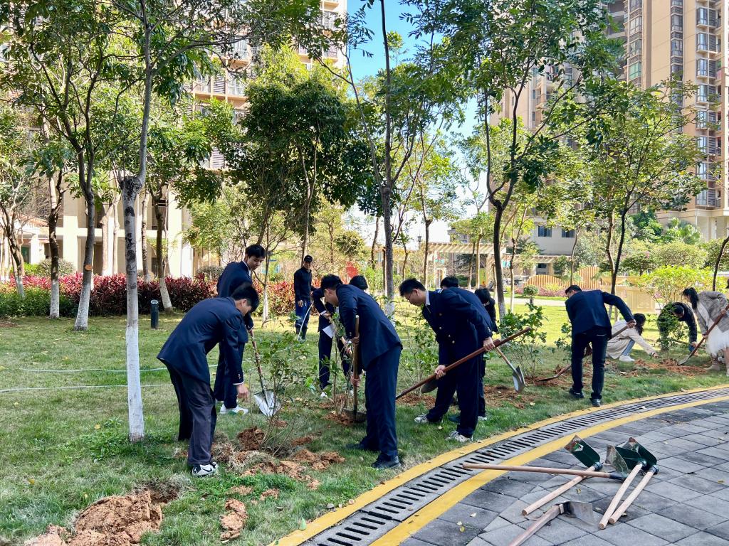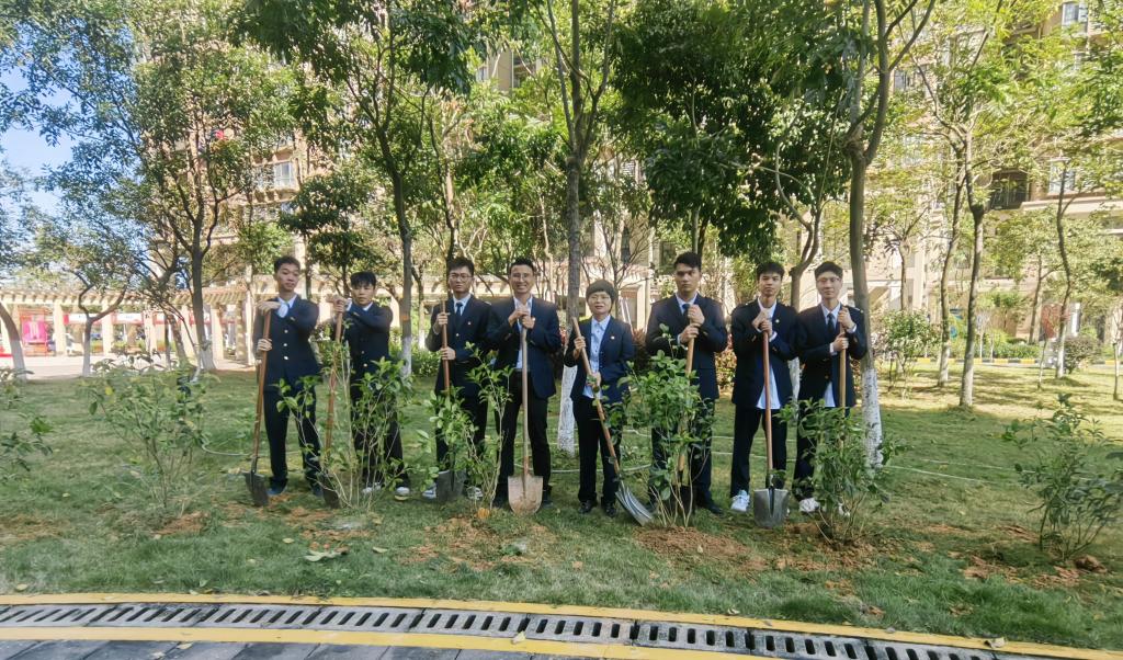 活动现场,老师和同学们热情高涨,纷纷拿起铲子、铁锹等工具,大家相互配合,密切协作,挥锹挖坑、扶树填土、浇灌树木,每道工序进行得井然有序,众人精神抖擞、干劲十足,植树活动在一片欢声笑语中进行得如火如荼。一片忙碌过后,一棵棵桂花树错落有致、迎风挺立,绽放出最美姿态,给社区增添无限“绿”能量。