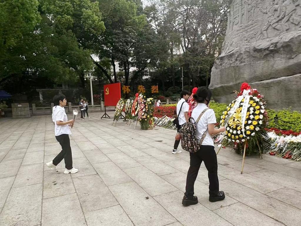 活动当天,师生们来到烈士陵园,在讲解员的引导下,穿过典雅端庄的朱漆金端大铁栅门,在陵墓大道两旁苍松翠柏如肃立的卫士,二十个花坛中红花竞相吐艳,象征革命烈士的鲜血洒在大地,在正中央,烈士纪念碑巍然耸立,烈士陵园庄严肃穆。来到广州起义烈士纪念碑前,映入眼帘是纪念碑上刻着的大字“广州起义烈士永垂不朽”。师生们在纪念碑前整齐列队,瞻仰广州起义纪念碑,为革命先烈默哀,并送上鲜花,行三鞠躬礼。