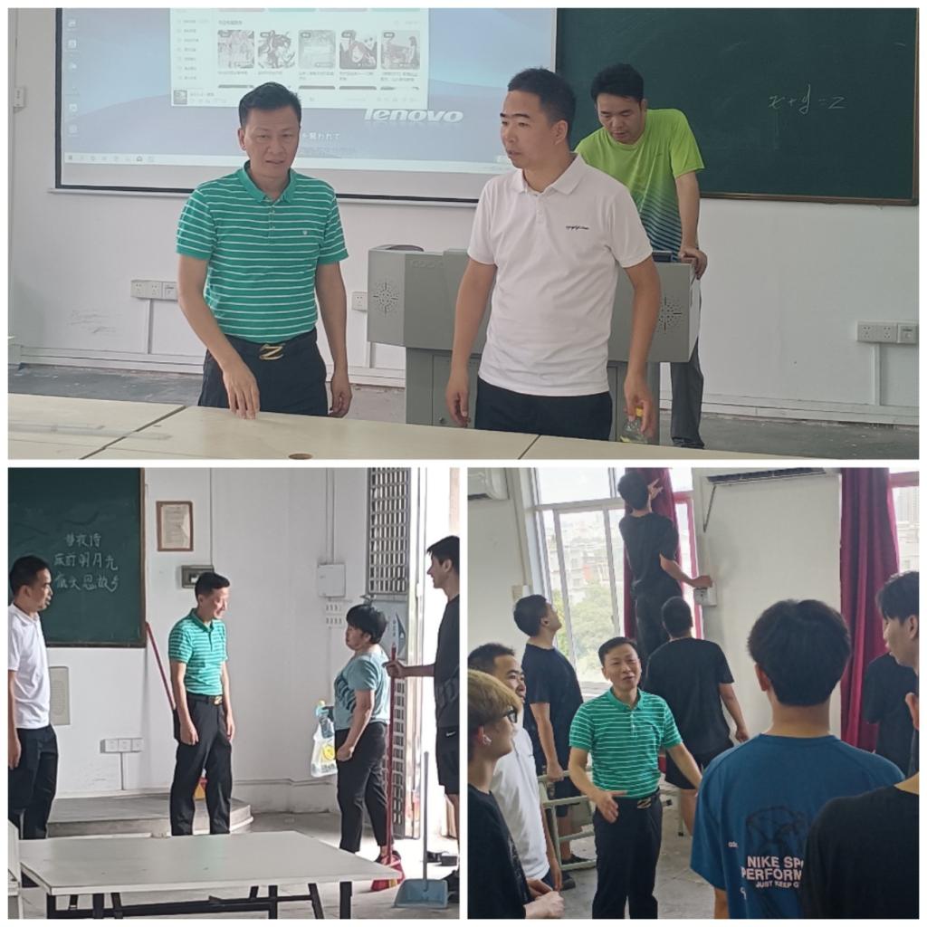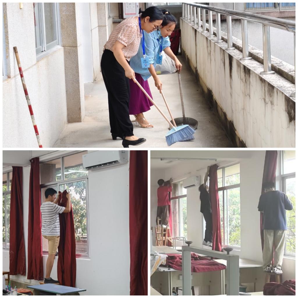 开学在即,保障先行。暑假期间,学校对琶洲校区教学楼及图书馆等教学场所统一施工并更换门窗,为同学们创造良好的教学环境。在施工期间,数字媒体与交互明胜m88官网实训中心的老师全程配合跟踪,保障设备设施安全。临近开学,学院积极组织部分师生对琶洲校区画室、明胜m88官网实训室等场地进行了全面彻底打扫、整理,确保新学期教学工作顺利开展。明胜m88官网副院长马菁带领实训中心全体老师一起上阵,在清扫过程中不怕脏不怕累,挂窗帘、抹墙壁、倒垃圾,脏活累活和难干的活都亲力亲为;辅导员吕志强组织同学们也干得热火朝天,擦桌子、扫地、拖地板,干起活来认真细致,“劳动最光荣”的快乐荡漾在师生们脸上。