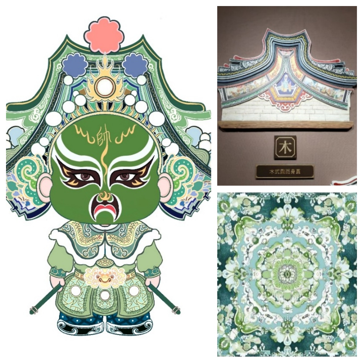 (2)绿纹云翔:“绿纹云翔”头饰以木者“头圆而身直”的姿态,给人一种很有生命力的感觉,绿色脸谱与金色云纹头饰,似厝角雕花与祥云交融。