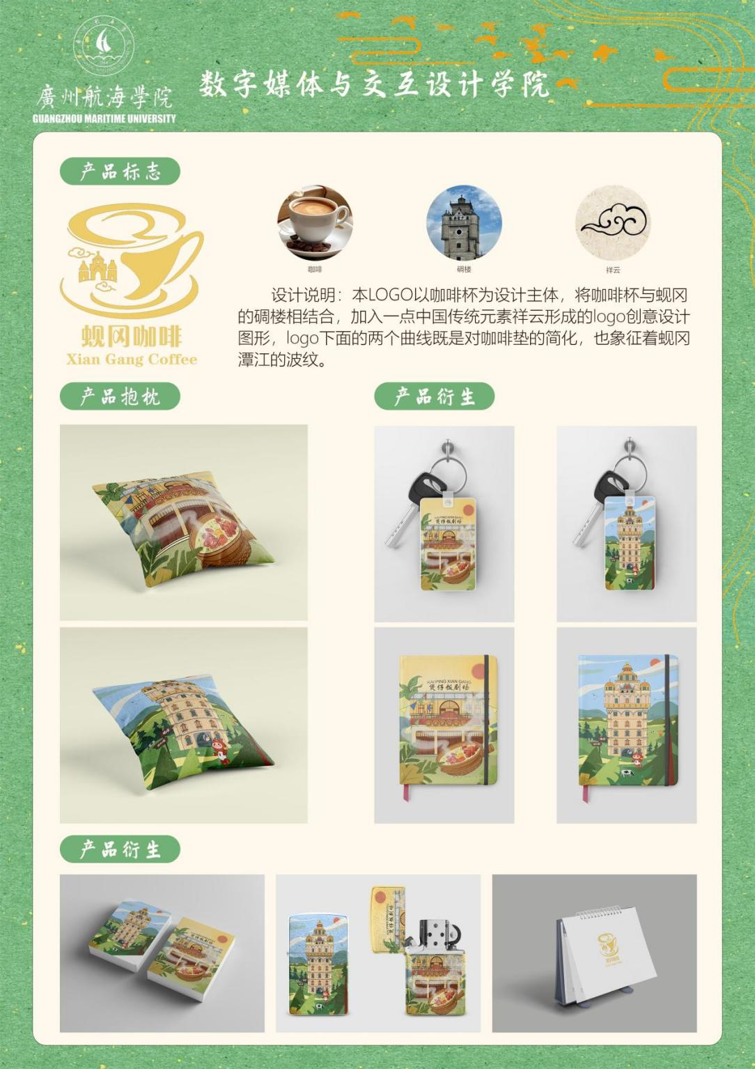 优秀奖作品《乡村振兴视角下的开平岘冈咖啡文创产品设计》:以当地经典建筑“开平第一楼”的瑞石楼和“煲仔饭剧场”为主要设计元素进行文创设计,选取当地的自然色彩,如稻田的金黄、山峦的翠绿等,深入剖析碉楼的建筑风格、装饰元素以及侨乡的人文故事、传统习俗等,将这些文化元素巧妙地融入到产品的外观、包装、品牌故事等各个方面。例如,以碉楼的轮廓为灵感设计咖啡杯的形状,在杯身上绘制碉楼的精美图案或雕刻相关的纹理,使消费者在品尝咖啡的同时,仿佛能触摸到蚬冈的历史脉络。融合西方咖啡文化的优雅与蚬冈本土的质朴,打造出具有国际视野又不失地方特色的产品风格,为咖啡文创产品注入新的文化内涵。