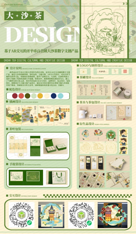 一等奖作品《开平大沙茶数字文创产品设计》:以岭南地域茶文化为灵感,以开平市百合镇大沙茶作为设计对象,是具有AR交互功能的数字文创产品。通过大沙茶的制茶图、茶叶包装、主题文创、AR交互等设计,可以宣传当地特有的茶文化、突破固有消费群体、提升产品吸引力、互动性。在创作风格上选择了国画工笔的线条感与画面感,整体以中、低饱和的暖色调色彩为主,融入了当地特有的文化元素,旨在帮助当地大沙茶提升用户数量、突破原有宣传方法等。
