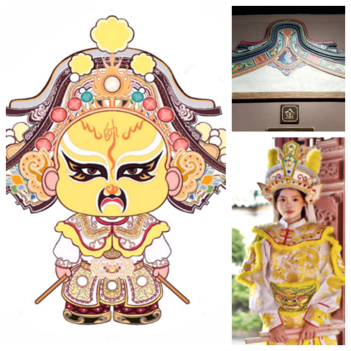 (5)橙焰宝檐:“宝檐”喻头饰如珍宝屋檐,橙色脸谱与土式厝角头象征着稳重和包容。土式厝角头寓意着根基稳固,契合宋江领袖气魄与角色威严。
