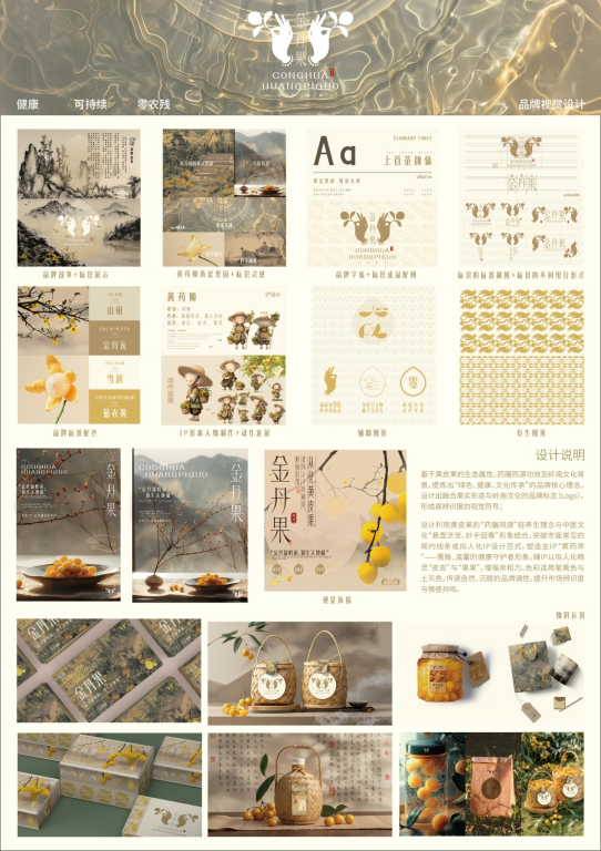 三等奖作品《从化黄皮果品牌设计》:基于黄皮果的生态属性、药膳同源功效及岭南文化背景,提炼出“绿色、健康、文化传承”的品牌核心理念,设计出融合果实形态与岭南文化的品牌标志(Logo),形成高辨识度的视觉符号;设计利用黄皮果的“药膳同源”轻养生理念与中医文化“悬壶济世、妙手回春”形象结合,突破市面常见的简约线条或拟人化IP设计范式,塑造主IP“黄药师”——儒雅、温馨的健康守护者形象。辅IP以拟人化精灵“皮皮”与“果果”,增强亲和力。色彩选用菊黄色与土灰色,传递自然、沉稳的品牌调性,提升市场辨识度与情感共鸣。
