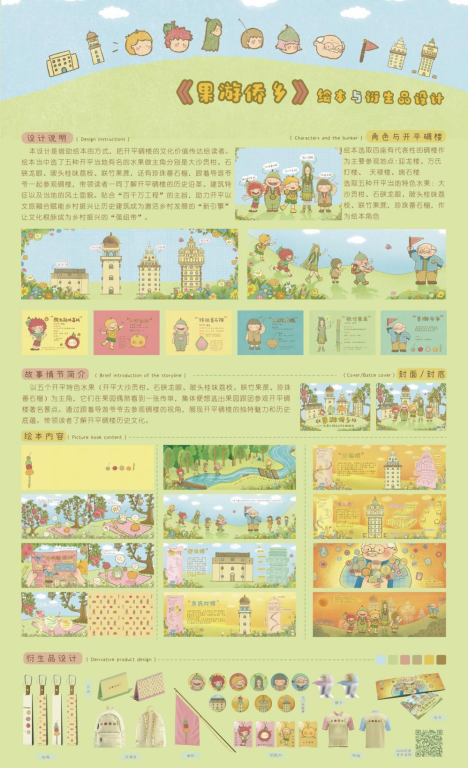 优秀奖作品《果游侨乡》绘本与衍生品设计:本设计是借助绘本的方式,把开平碉楼的文化价值传达给读者。绘本当中选择五种开平当地特色水果做主角分别是大沙贡柑、石硖龙眼、陂头桂味荔枝、联竹果蔗,还有珍珠番石榴,跟着导游爷爷参观碉楼,带领读者一同了解开平碉楼的历史沿革、建筑特征以及当地的风土面貌。贴合“百千万工程”的主旨,助力开平以文旅融合赋能乡村振兴让历史建筑成为激活乡村发展的“新引擎”让文化根脉成为乡村振兴的“强纽带”。