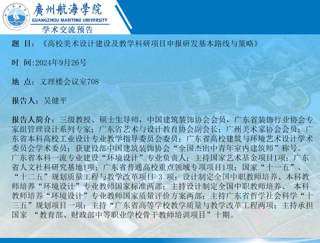 吴健平教授学术报告会预告:高校美术与设计专业建设及教学科研项目申报研发的基本路线和策略