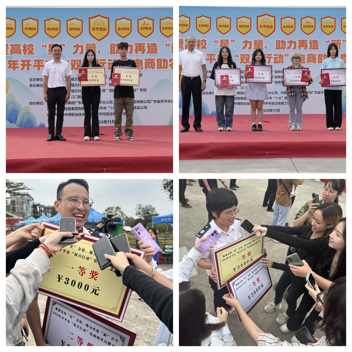 2024年11月17日,由开平市“百县千镇万村高质量发展工程”指挥部主办的主题为“凝聚高校‘星’力量,助力再造‘新’开平”的2024年开平市“双百行动”电商助农直播大赛圆满落下帷幕。在本次大赛中,我校数字媒体与交互明胜m88官网的广航农心椰椰队和农宝助力官队凭借着出色的表现和优异的销售成绩,分别荣获本次大赛的一等奖和二等奖;冼永权和余姣被评为“优秀指导老师”。