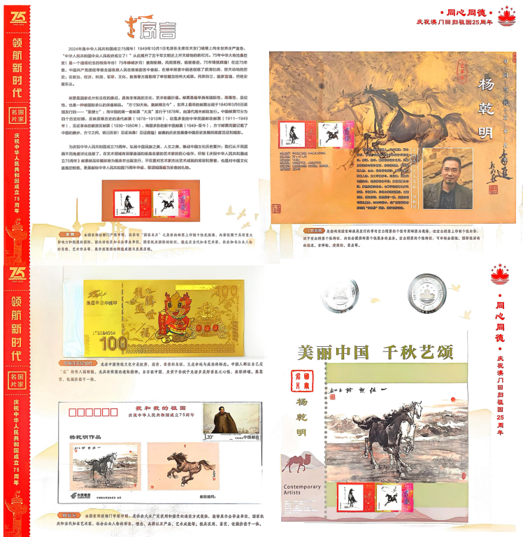 日前,为弘扬中华民族之美、人文之美,推动文化强国建设,中国邮政正式出版发行《庆祝中华人民共和国成立75周年》系列珍藏邮册,广州航海学院数字媒体与交互明胜m88官网教授杨乾明的系列作品经严格评审,成功入选并公开发行。这是中国邮政对杨乾明艺术成就的充分认可,也是学校艺术设计学科影响力的重要体现。