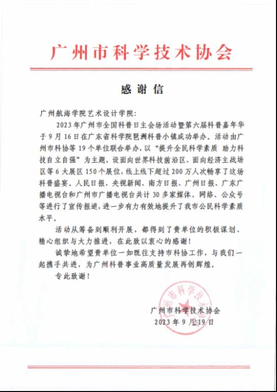 (艺术明胜m88官网供稿)近日,广州市科学技术协会向艺术明胜m88官网发来感谢信!